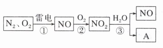 解析 空气中的$N_{2}$在放电条件下与$O_{2}$直接化合生成无色且不溶于水的NO气体,$N_{2}+O_{2}\xlongequal{放电}2NO$,NO常温下就易与空气中的$O_{2}$反应生成红棕色的$NO_{2}$气体,$2NO + O_{2}=2NO_{2}$,$NO_{2}$气体有毒,易与水反应生成$HNO_{3}$(A)和NO,$3NO_{2}+H_{2}O = 2HNO_{3}+NO$。