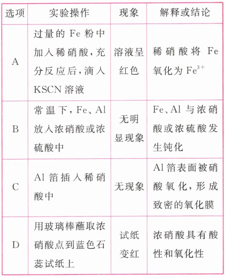 B [稀硝酸与铁粉反应,铁首先被氧化成$Fe^{3+}$,过量铁粉将$Fe^{3+}$还原,最终得到$Fe^{2+}$,滴入$KSCN$溶液不显红色,A项错误;常温下,$Fe$、$Al$在浓硝酸或浓硫酸中发生钝化,生成致密的氧化物保护膜阻止了反应进行,B项正确;$Al$箔能与稀硝酸反应放出气体,C项错误;浓硝酸具有强氧化性,点到蓝色石蕊试纸上,一段时间后会褪色。]