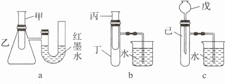 (2) 某同学选用装置 a 进行实验(实验前 U 形管里液面左右相平),在甲试管中加入适量$Ba(OH)_{2}$溶液与稀硫酸,U 形管中可观察到的现象是______,说明该反应属于______(填“吸热”或“放热”)反应。