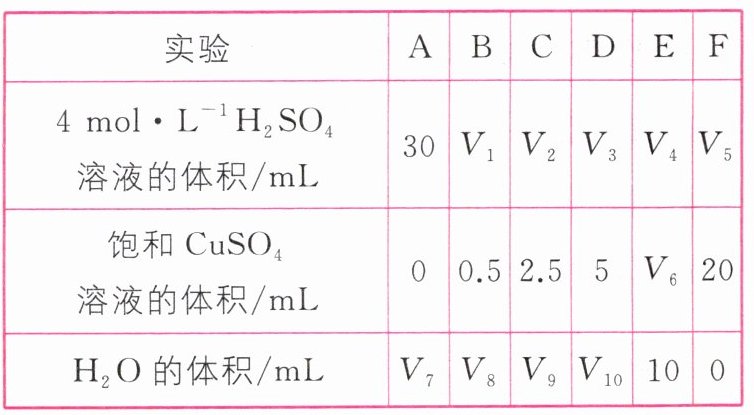 (5)为了进一步研究硫酸铜的量对氢气生成速率的影响,该同学设计了如下一系列的实验。将表中所给的混合溶液分别加入6个盛有过量Zn粒的反应瓶中,收集产生的气体,记录获得相同体积的气体所需时间。