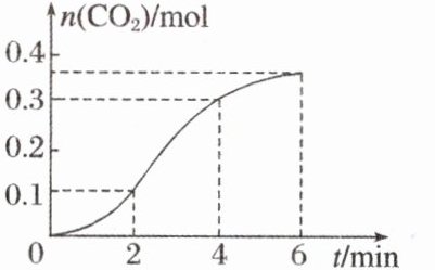 D [随着反应的进行$c(H^{+})$减小,而前4 min内反应速率变大,根据反应是放热反应,可推出前4 min内温度对反应速率的影响比浓度大,A、B项正确;在2~4 min内$n(CO_{2})$的变化量最大(或曲线的斜率最大),可判断出平均反应速率最大,C项正确;由题意及题图可知,该题不知道容器体积,故不能计算出反应速率。]