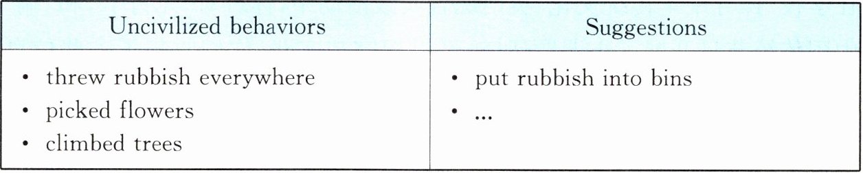 |• threw rubbish everywhere• picked flowers• climbed trees|• put rubbish into bins•...|