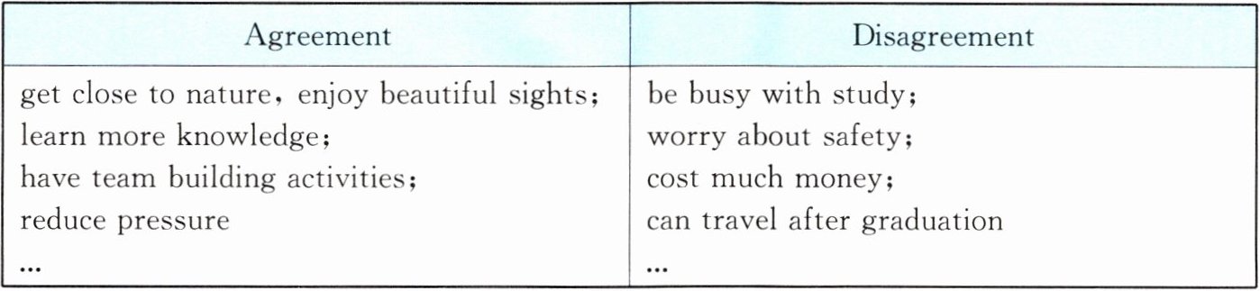 |get close to nature, enjoy beautiful sights;learn more knowledge;have team building activities;reduce pressure...|be busy with study;worry about safety;cost much money;can travel after graduation...|