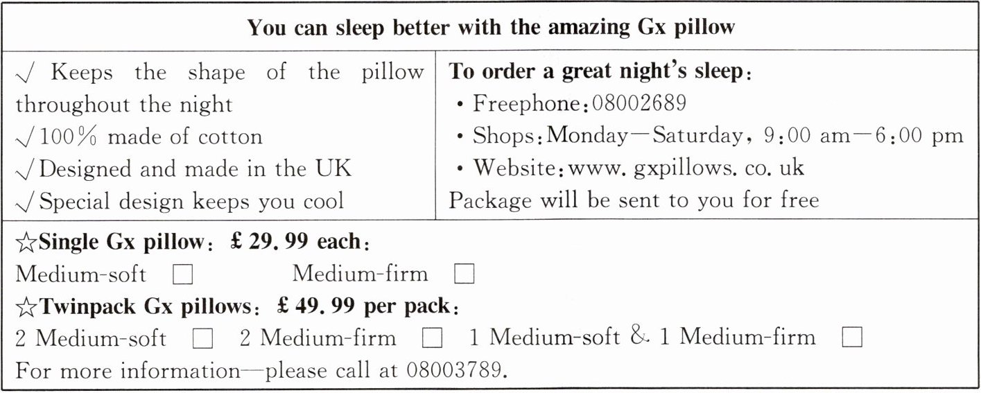 )16. How can you order an amazing Gx Pillow?A. Call Gx Pillow at 08003789. B. Send an email to Gx Pillow.