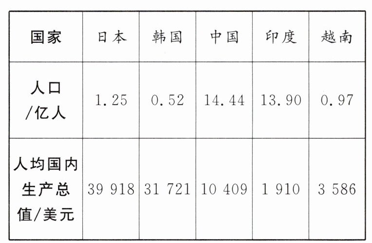 亚洲是世界上人口最多的大洲,大洲内部国家文化多样,经济差异明显。下表为某年亚洲部分国家人口数量和人均国内生产总值数据。据此完成6~7题。