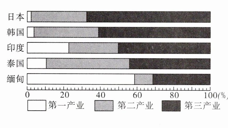 10.D 11.C 解析 第10题,由图可知,缅甸的第一产业比重接近60%,是五个国家中所占比重最大的。故选D。第11题,由图可知,五个国家产业构成差异很大,这说明亚洲各国经济发展水平差异很大。故选C。