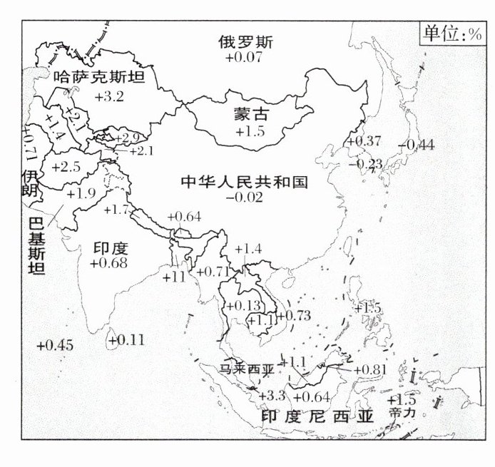 8.A 9.C 解析 第8题,由图可知,中国周边各国2022年人口增长率呈负增长的国家集中分布在东亚,A正确;东南亚、南亚、西亚等国家人口均呈正增长,B、C、D错误。第9题,由图可知,虽然我国周边的东亚等几个国家人口出现了负增长,但亚洲大多数国家人口仍是正增长,人口仍然增长较多,不会出现劳动力匮乏和老龄化程度加剧的问题。故选C。
