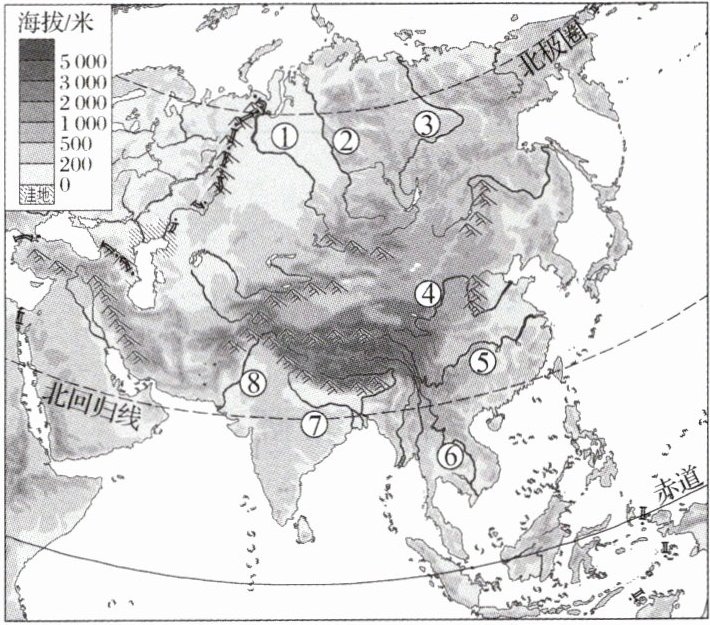 (2)主要地形区分布:中部以______高原和帕米尔高原最为高峻;四周分布着较低的地形区,如图中______平原、中西伯利亚高原、东西伯利亚山地、______平原、华北平原、恒河平原、______高原、印度河平原、伊朗高原等。