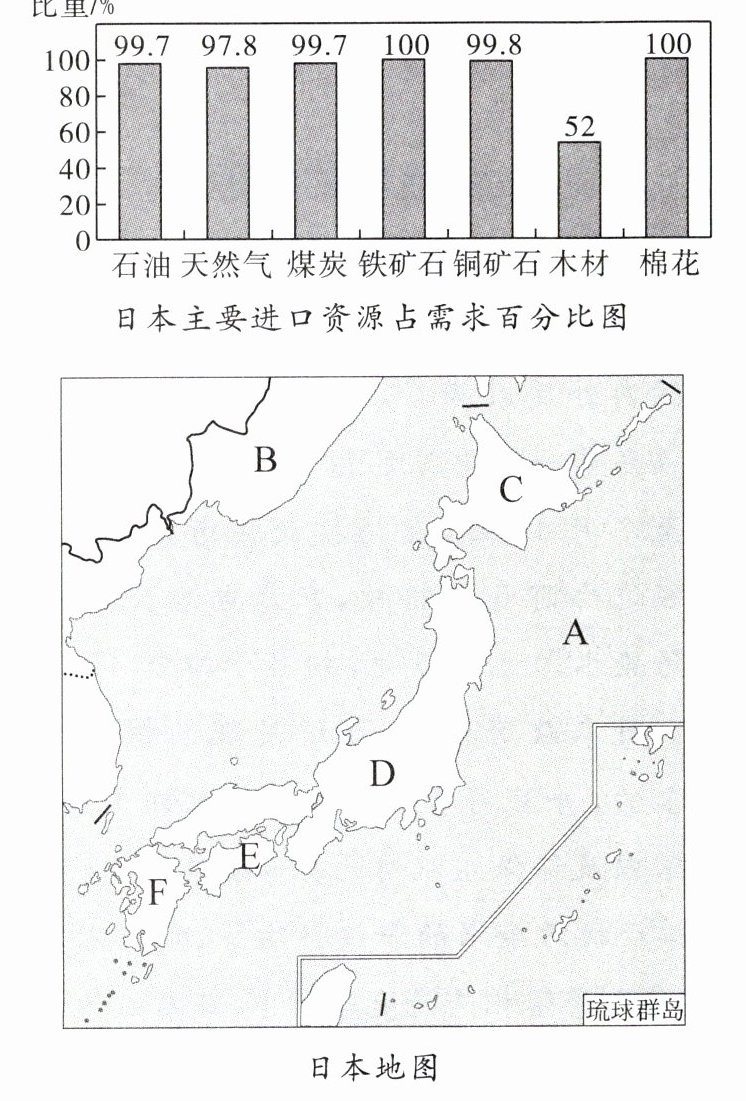 读日本主要进口资源占需求百分比图和日本地图,完成下列各题。