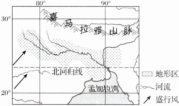 印度某地形区人口稠密,约有7.16亿人,人口密度约为961人/千米²,是世界上人口密度最大的地区之一。读该地形区范围示意图,完成9~10题。