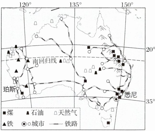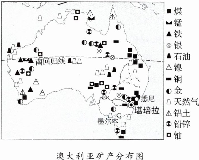 (4)读澳大利亚矿产和城市分布图,结合所学知识,分析澳大利亚被称为“坐在矿车上的国家”的原因。