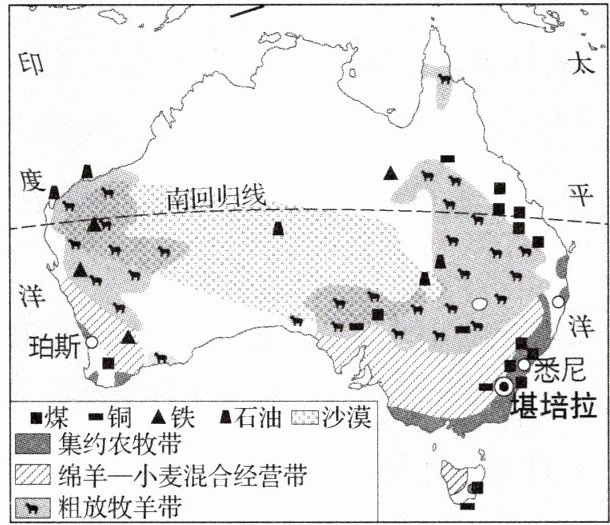 澳大利亚是世界上唯一独占一个大陆的国家,主要领土包括澳大利亚大陆、塔斯马尼亚岛和附近一些岛屿,澳大利亚自然环境独特,采矿业、农牧业发达。下图为澳大利亚牧羊带及矿产资源分布图。据此完成9~10题。