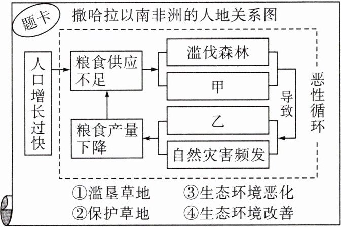 6. B 7. C 8. C 解析 第6题,读题卡可知,人口的快速增长,导致粮食产量不足,撒哈拉以南非洲的居民为了满足粮食供应,进行滥伐森林和滥垦草地的活动,但也因此导致了当地生态环境的恶化和自然灾害的频发,进而导致粮食产量下降,当地被迫再次进行毁林开荒,陷入恶性循环。甲处应填写①,乙处应填写③。故选B。第7题,当地居民滥伐森林主要是为了扩大耕地面积,满足日益增长的粮食需求。故选C。第8题,根据题卡可知,撒哈拉以南非洲人地关系恶性循环的根本原因是人口增长过快。故选C。