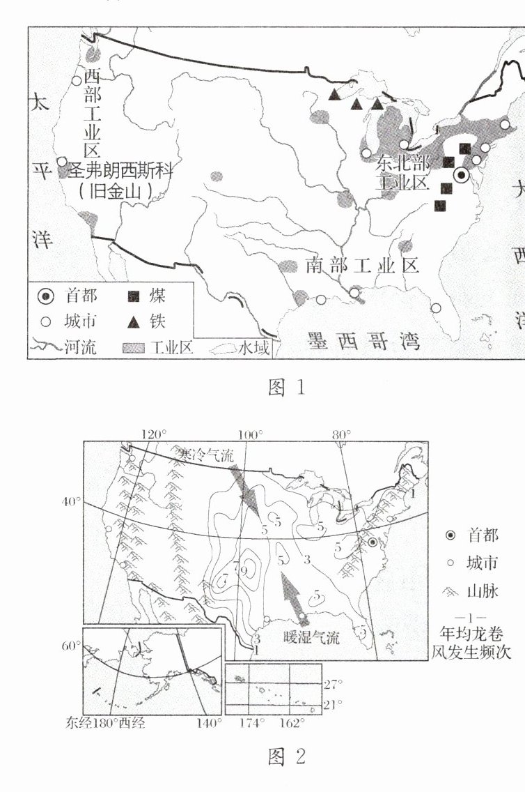 美国分为三大工业区,东北部工业区属于传统工业区,西部工业区和南部工业区新兴工业发展迅速,被称为“阳光地带”。2024年6月8日,美国中西部遭遇龙卷风、冰雹等极端天气。读美国本土主要工业区图(图1)和美国年均龙卷风发生频次示意图(图2),完成下列各题。
