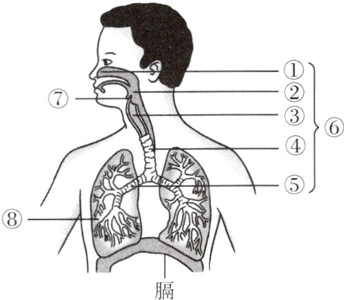 解析 题图中①是鼻,②是咽,③是喉,④是气管,⑤是支气管,⑥是呼吸道,⑦是会厌软骨,⑧是肺。