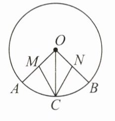 5. 如图,在⊙O中,OA,OB,OC是⊙O的三条半径,C是$\overset{\frown}{AB}$的中点,M,N分别是OA,OB的中点,连结MC,NC. 求证:MC = NC.