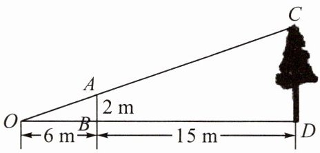 例5 如图,为了测量某棵树(CD)的高度,小刚用长为2 m的竹竿(AB)作测量工具,移动竹竿,使竹竿顶、树顶的影子恰好落在地面的同一点(O),此时竹竿与这一点相距6 m,与树相距15 m,那么这棵树的高度为( )