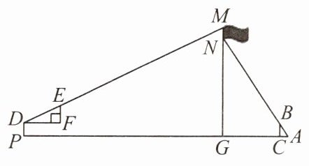 4. 某校升起了共青团旗帜,李优和贺基旭想用所学知识测量该旗帜的宽度MN,他们进行了如下操作:如图,首先,李优在C处竖立一根标杆BC,地面上的点A,标杆顶端B和点N在一条直线上,BC = 1.5 m,AC = 1 m,AG = 8 m;然后,贺基旭手持自制直角三角形纸板DEF,使长直角边DF与水平地面平行,调整位置,恰好在点P时点D,E,M在一条直线上,且DP = 1.5 m,PG = 23.6 m,DF = 2EF. 已知DP⊥PA,MG⊥PA,BC⊥PA,点P,G,C,A在同一水平直线上,点N在MG上,求旗帜的宽度MN.