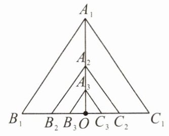 例2 如图所示,由位似的正△A₁B₁C₁,正△A₂B₂C₂,正△A₃B₃C₃,…,正△AₙBₙCₙ组成相似图形,其中第一个△A₁B₁C₁的边长为 1,O 是 B₁C₁的中点,A₂是 OA₁的中点,A₃是 OA₂的中点,…,Aₙ是 OAₙ₋₁的中点,顶点 B₂,B₃,…,Bₙ,C₂,C₃,…,Cₙ都在边 B₁C₁上.