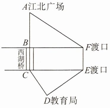 1. 如图,家住江北广场的小李经西湖桥到教育局上班,路线为A→B→C→D,因西湖桥维修封桥,他只能改道经临津门渡口乘船上班,路线为A→F→E→D,已知BC//EF,BF//CE,AB⊥BF,CD⊥DE,AB = 900 m,BC = 800 m,∠AFB = 37°,∠DCE = 53°. 请你计算小李上班的路程因改道加了多少?(结果保留整数;参考数据:sin 37°≈0.60,cos 37°≈0.80,tan 37°≈0.75)