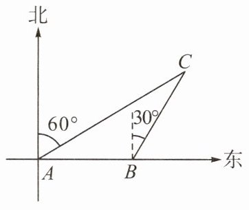 1. 如图,一艘船由西向东航行,在A处测得北偏东60°方向上有一座灯塔C,再向东继续航行60 km到达B处,这时测得灯塔C在北偏东30°方向上,已知在灯塔C的周围47 km内有暗礁,这艘船继续向东航行是否安全?($\sqrt{3}\approx1.7$)