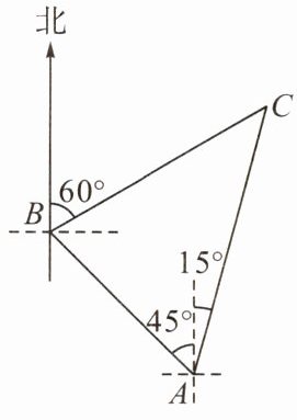 例1 手机导航极大方便了人们的出行. 如图,嘉琪一家自驾到风景区C游玩,到达A地后,导航显示车辆应沿北偏西45°方向行驶4 km至B地,再沿北偏东60°方向行驶一段距离到达风景区C,嘉琪发现风景区C在A地的北偏东15°方向,那么B,C两地的距离为( )