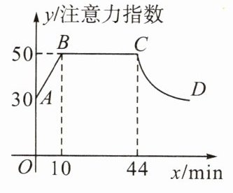 例1 一般情况下,中学生完成数学家庭作业时,注意力指数随时间$x$(min)的变化规律如图所示(其中$AB$,$BC$为线段,$CD$为双曲线的一部分).