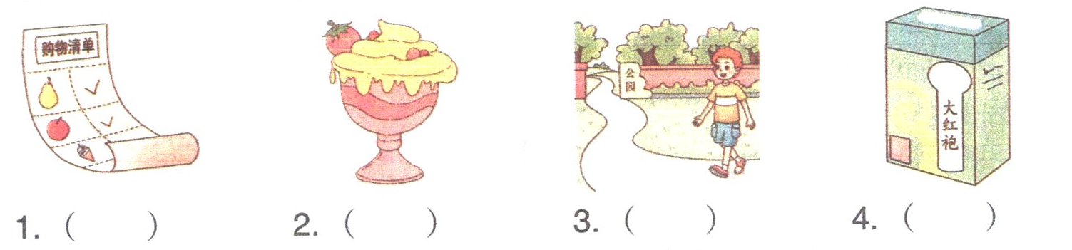 一、(情境新题)Jenny一家人准备去超市来个食材大采购。根据购物清单内的图片提示,将食物名称写在横线上,并按提示将食物选项放入不同的购物袋里。
