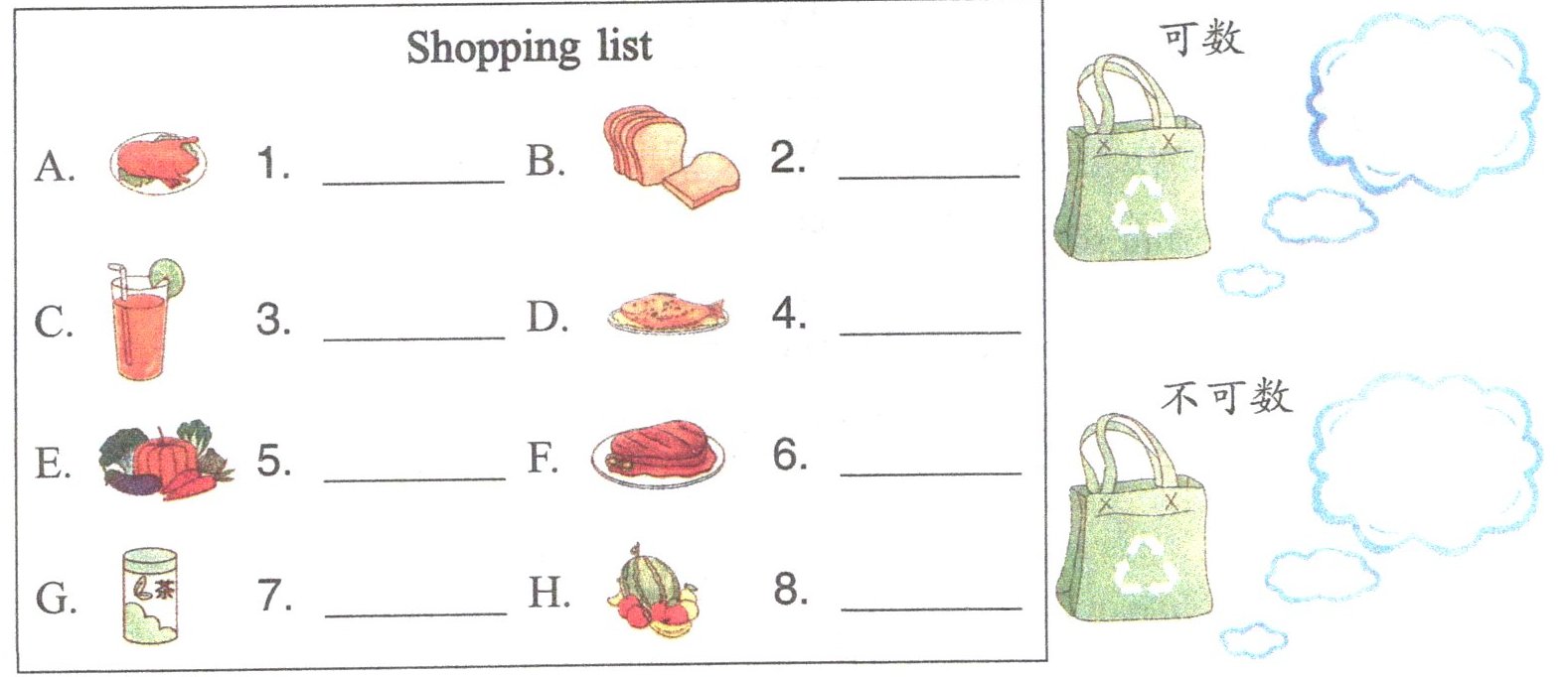 1. chicken 2. bread 3. juice 4. fish 5. vegetables 6. beef 7. tea 8. fruits 可数:E H 不可数:A B C D F G