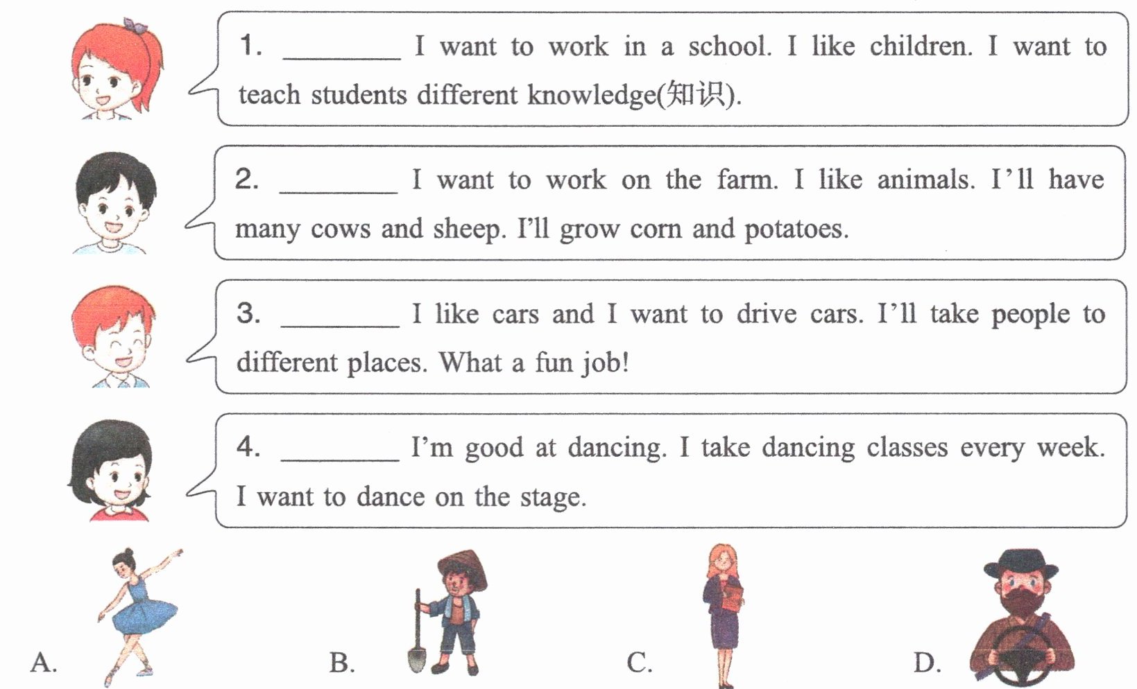 六、(情境新题)六年级二班的四个同学正在讨论他们梦想的工作。根据描述选图片。