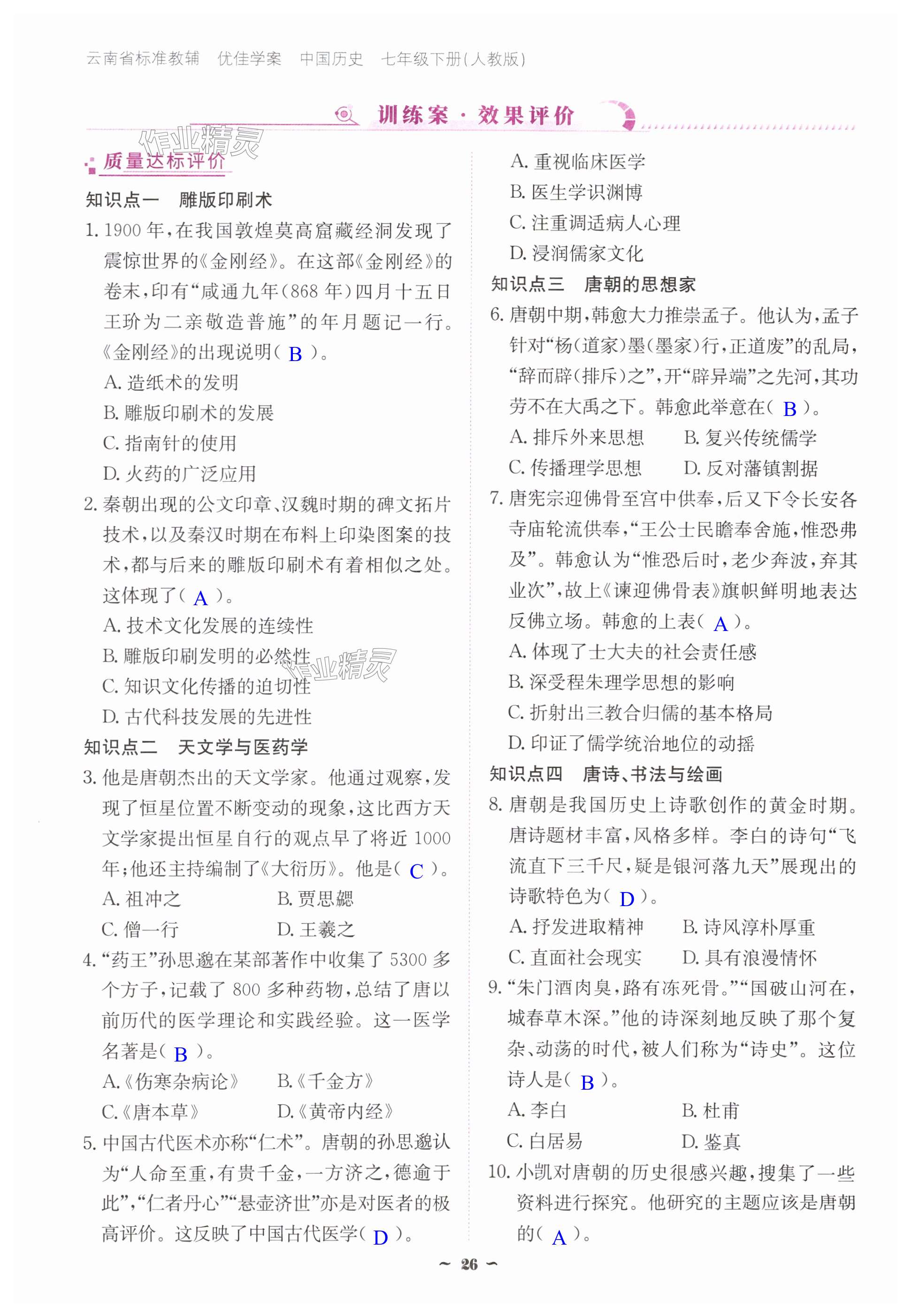 注:目前有些书本章节名称可能整理的还不是很完善,但都是按照顺序排列的,请同学们按照顺序仔细查找。练习册 2025年云南省标准教辅优佳学案七年级历史下册人教版 答案主要是用来给同学们做完题方便对答案用的,请勿直接抄袭。