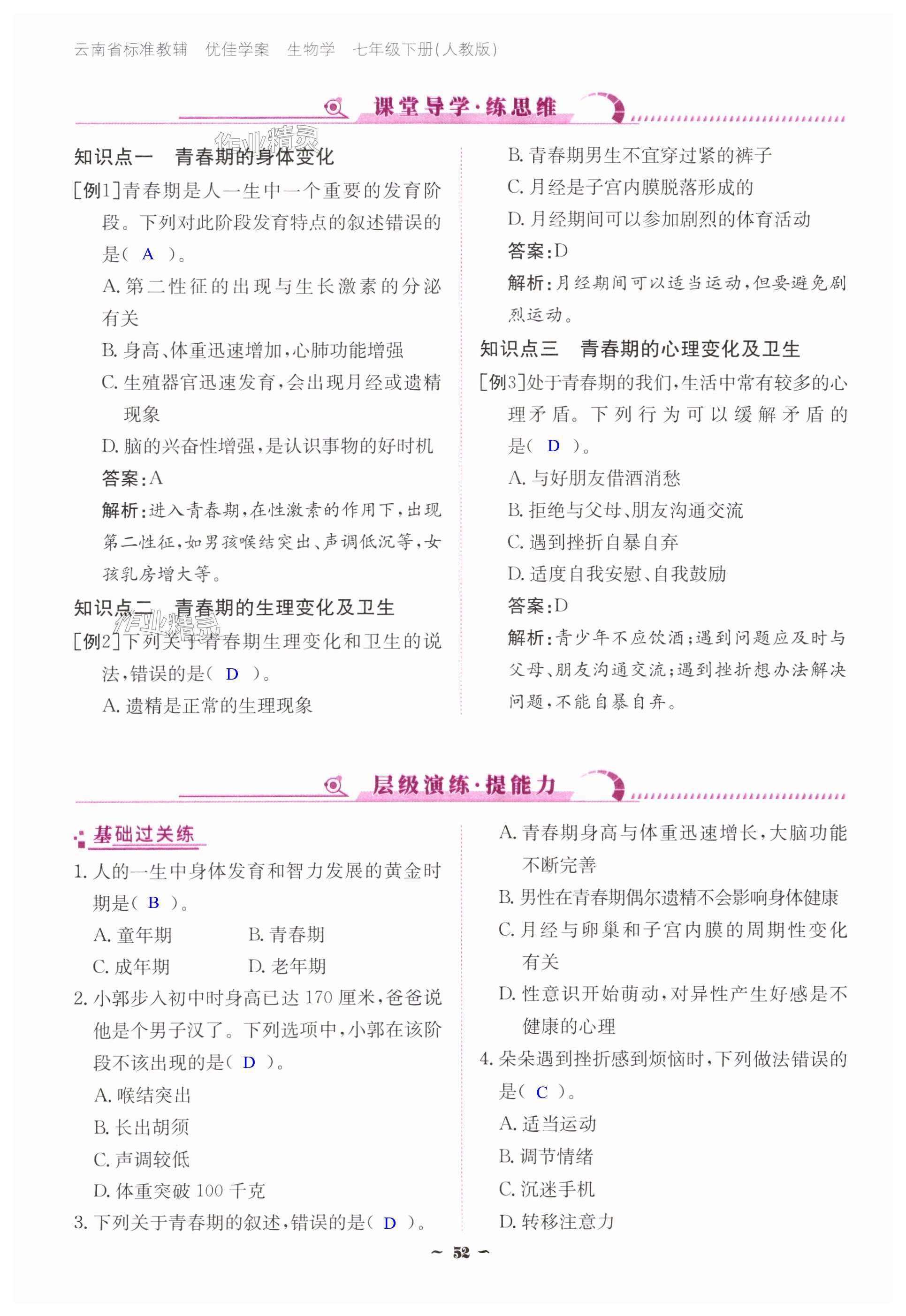 注:目前有些书本章节名称可能整理的还不是很完善,但都是按照顺序排列的,请同学们按照顺序仔细查找。练习册 2025年云南省标准教辅优佳学案七年级生物下册人教版 答案主要是用来给同学们做完题方便对答案用的,请勿直接抄袭。