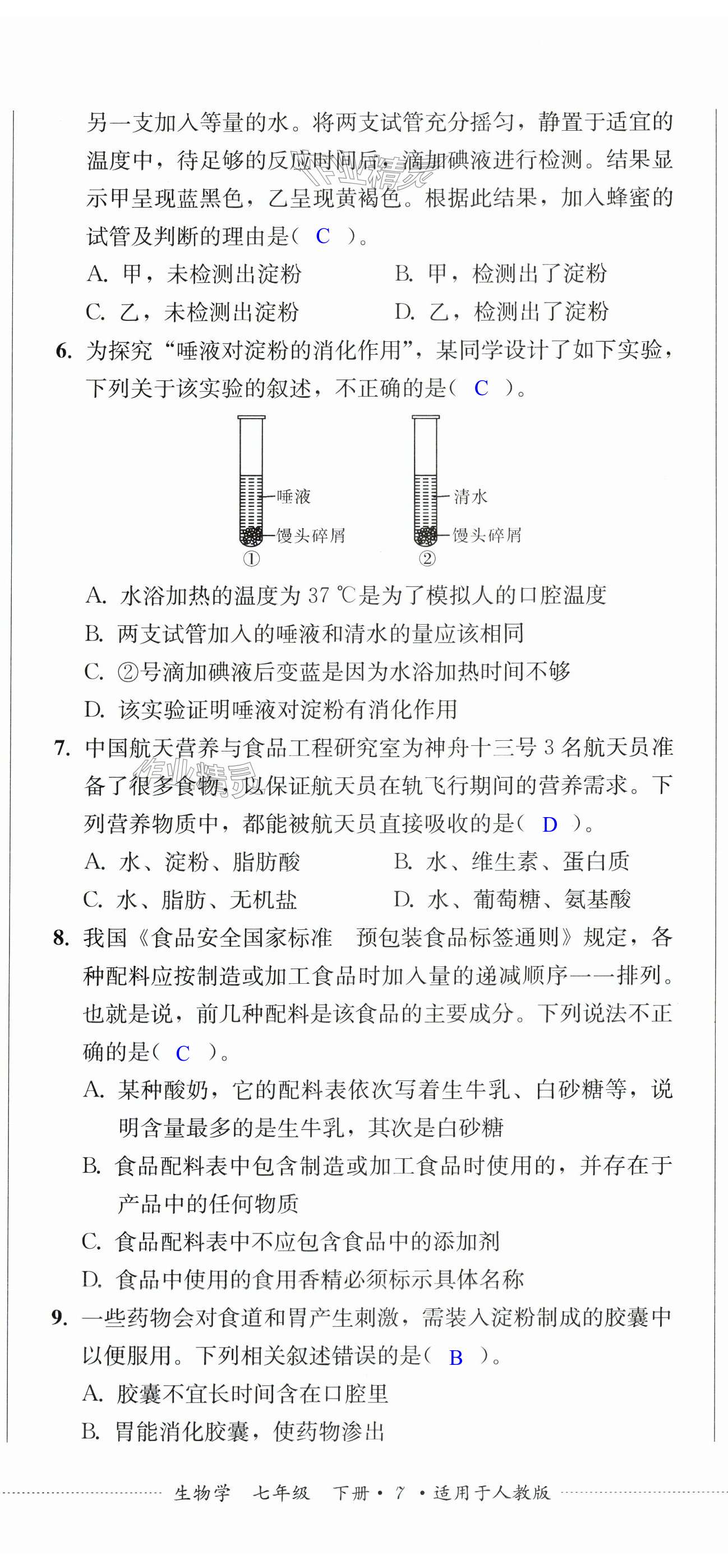注:目前有些书本章节名称可能整理的还不是很完善,但都是按照顺序排列的,请同学们按照顺序仔细查找。练习册 2025年同步练与测七年级生物下册人教版 答案主要是用来给同学们做完题方便对答案用的,请勿直接抄袭。