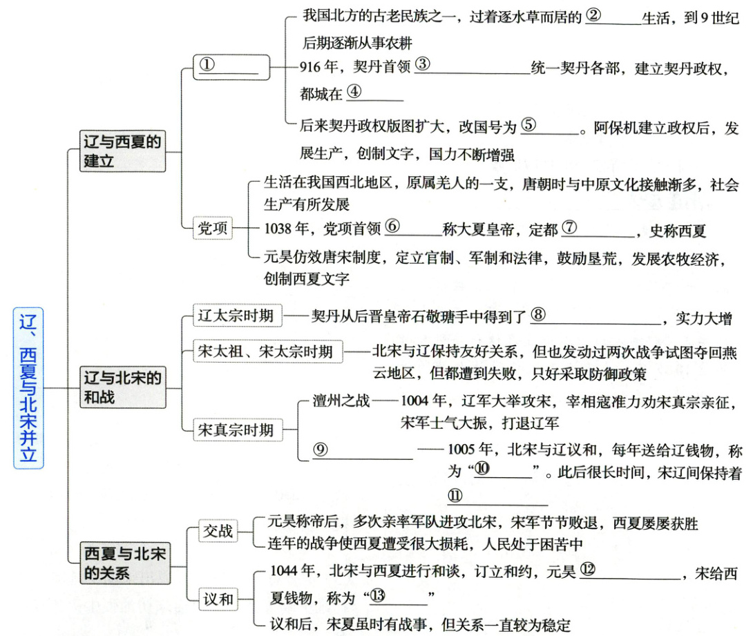 ①契丹 ②游牧 ③耶律阿保机 ④上京 ⑤辽 ⑥元昊 ⑦兴庆府 ⑧燕云十六州 ⑨澶渊之盟 ⑩岁币 ⑪和平局面 ⑫向宋称臣 ⑬岁赐
