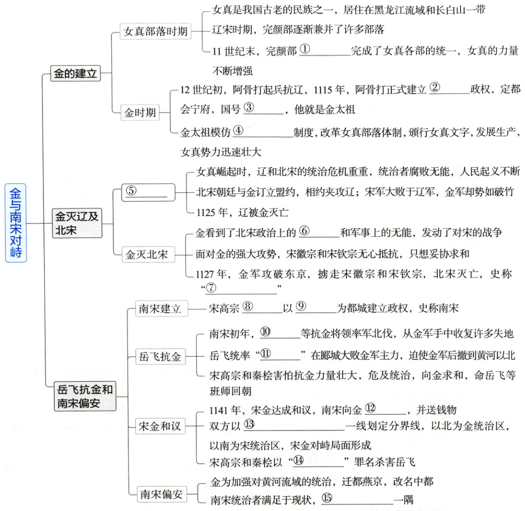 ①阿骨打 ②女真 ③大金 ④中原王朝 ⑤金灭辽 ⑥腐败 ⑦靖康之变 ⑧赵构 ⑨临安 ⑩岳飞 ⑪岳家军 ⑫称臣 ⑬淮水至大散关 ⑭莫须有 ⑮偏安江南
