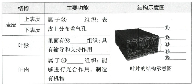 2. 运输:茎内运输水和无机盐的结构是③______,方向是④__________,属于⑤__________组织,每根导管都是由许多长形、管状的⑥__________细胞构成的,这些细胞没有细胞质和细胞核,上下细胞间的细胞壁已经消失,形成了中空的管道。