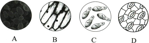 D 解析:A选项为显微镜下的酵母菌,B选项为显微镜下的植物细胞,C选项为显微镜下的草履虫,D选项为显微镜下的保卫细胞,属于叶的表皮。故选D。