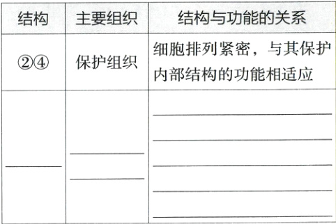 (2)用显微镜观察时,小宇发现叶片由多种组织构成,并认为每种组织的结构都是与其功能相适应的。请你从图二所示的①③两种结构中任选一种,仿照表中的示例,填写表格: