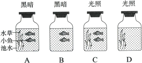 A 解析:在黑暗环境中,水草不能进行光合作用,但仍能通过呼吸作用释放二氧化碳,小鱼也要进行呼吸作用释放二氧化碳,故二氧化碳浓度增加最快,A符合题意。B选项中只有小鱼进行呼吸作用释放二氧化碳,B不符合题意。C选项和D选项中的水草可以通过光合作用吸收二氧化碳,故生态瓶中二氧化碳含量较少。C、D不符合题意。故选A。