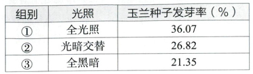 1. [2024昆明二模]小丽在“探究栽培一种植物所需的环境条件”跨学科实践中,研究了不同光照条件对玉兰种子萌发的影响,实验结果如下表。下列分析错误的是 ( )