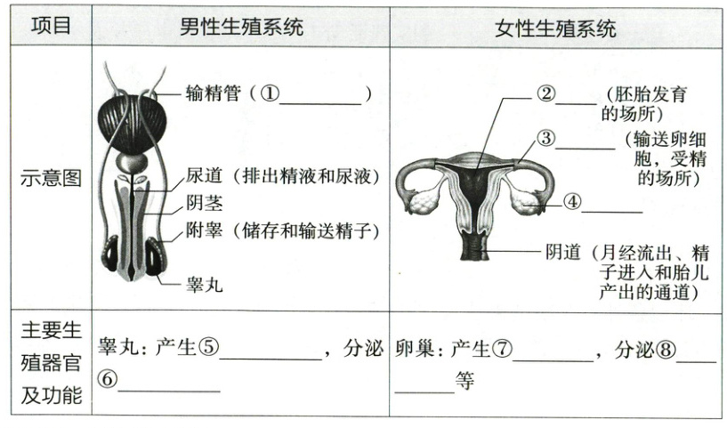 ①输送精子 ②子宫 ③输卵管 ④卵巢 ⑤精子 ⑥雄激素 ⑦卵细胞 ⑧雌激素