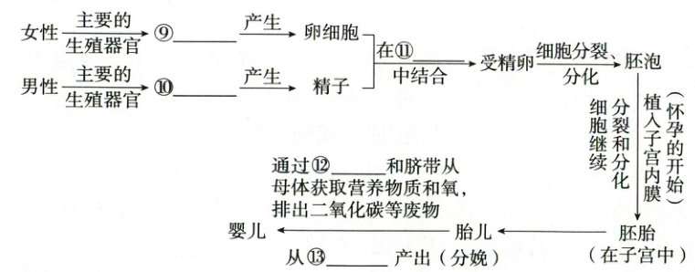 ⑨卵巢 ⑩睾丸 ⑪输卵管 ⑫胎盘 ⑬阴道