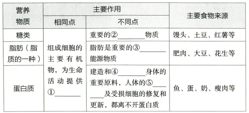 1. 水:占人体体重的⑥______。人体的各项生命活动,离开水都无法进行。人体内的营养物质以及尿素等代谢废物的运输都离不开水。