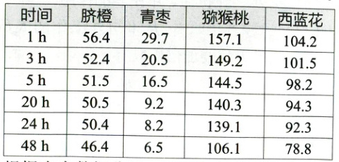 (4)用浸提剂浸提四种食物中的维生素C后,在不同时间段测定维生素C含量,结果如表所示。