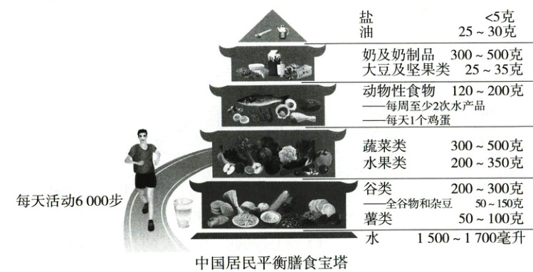 1. 中国居民平衡膳食宝塔将食物分为5大类,不同的面积大小体现了食物量的多少。下列食物中处于膳食宝塔最顶层的是 ( )