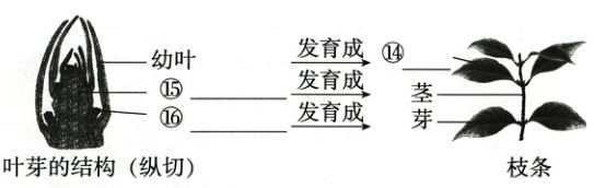 ⑭叶 ⑮芽轴 ⑯芽原基