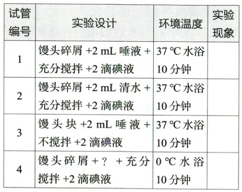 (4)研究性学习小组的同学在上述实验方案的基础上,想进一步探究某因素对唾液淀粉酶消化作用的影响,补加了4号试管,对照组是1号试管,请你根据所学的有关知识和上面实验方案判断,“?”处应填______,该探究活动的变量可能是______。