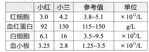 (3)经医生诊断,小兰患有急性肺炎,诊断依据之一是化验单上她的[ ]____数目过多,由此推断它的功能主要是____。小红的红细胞数过少和____含量过低,经常头晕、疲乏,推测患有____,在饮食中应该多吃一些富含____的食物。