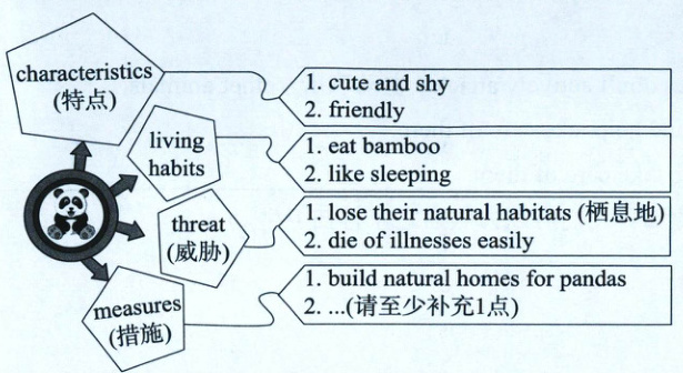 第二部分:说明大熊猫易危的原因——人们砍伐许多树木。(People cut down lots of trees.)——大熊猫很容易死于疾病。(Pandas could die of illnesses easily.)