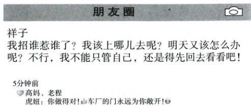 (1)祥子发这条朋友圈时应该发生了一些事,下面哪张图片放入朋友圈可以与当时情境吻合?谈谈你的看法。